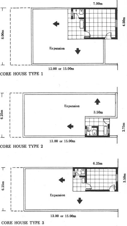 A Core-house, self-help development concept was agreed upon, with the inhabitants given the responsibility to extend their units both horizontally and later vertically. Core house lots ranged from 80-120 square meters with three core types ranging from a utility core to a room with a bathroom and kitchen space. Some foundation to guide expansion was also provided and units designed on a modular grid to allow residents to use the products of a planned prefabrication factory.
