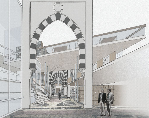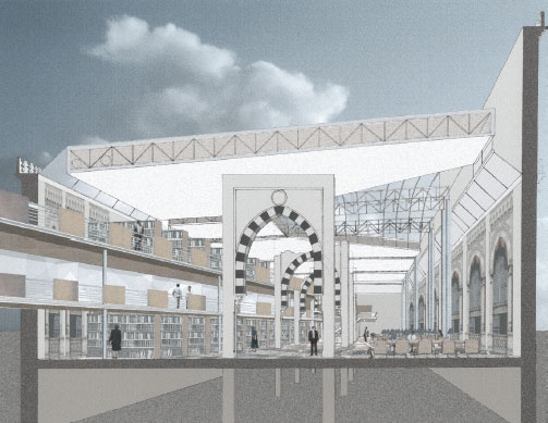 The final entry envisioned that the second floor of the building would be redesigned to house the calligraphed manuscripts of medieval Cairo while still maintaining the Islamic Museum in the lower level. The outside distinctive envelope of the building was preserved but it was proposed that the roof and the non-load bearing walls be removed. A new lightweight structure was then inserted around the archaeologically excavated arches that were maintained for structural and aesthetic purposes. The structural grid of the inserted structures was inspired by the siting and orientation of the building, thereby reminding users of its unique location between the medieval quarter and the modern city.