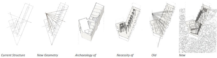 The two axes that represent the two parts of the building were extended to meet at a point. The point was projected in the third dimension to generate a vertical line. This line served as the reference from which the geometry of fanning the new structure was introduced.