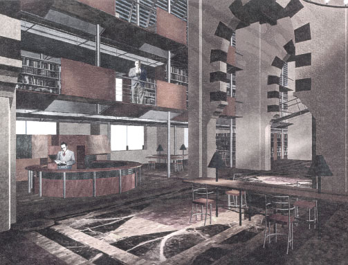 The view of the main reading room, or Great Hall (below) shows the integration of the old arches with the new structure. At the side are the mezzanine levels which are occupied by stacks and administrative offices. The view from the library entrance lobby, past the security gates (above), shows the new stairs penetrating the old courtyard turned atrium to provide access to the mezzanine levels.