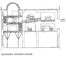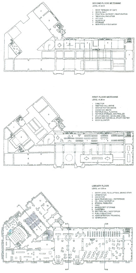 The rehabilitated building combines all of these elements of the architectural traditions of Egypt and the technological requirements of a modern library. Clerestory windows connect the old exterior skin of the building and new inserted structure at the roof level. Two large skylights are introduced; one transforms the entrance courtyard into an atrium, while the other is created on top of he great hall.