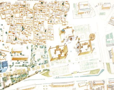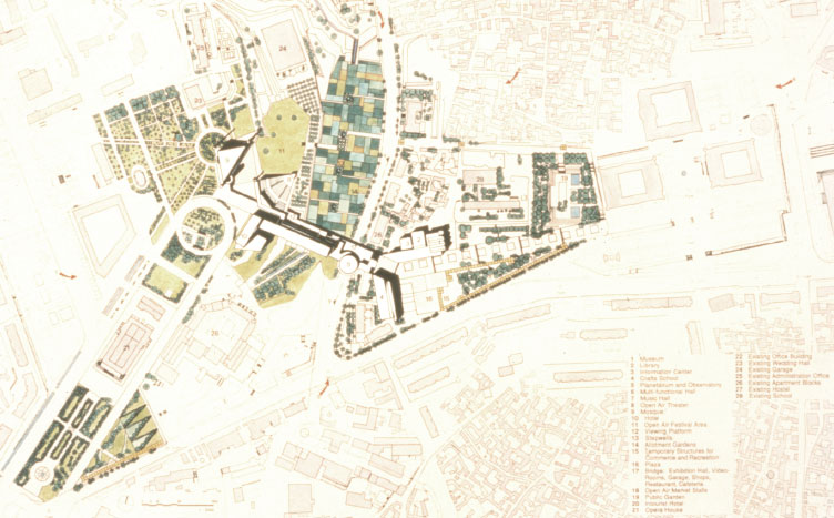 The bridge allows us to make a separation between vehicular and pedestrian traffic. Dagbit Street, the principal road through the site is left as it is, allowing cars to pass beneath the bridge. The major vehicular access to the area is extended to the center of the site and transformed into a destination point, terminating in a round about behind the Opera House. This round-about creates a western entrance to the bridge, which is at the same time an entrance to the major public facilities: the mosque, music hall, multi-purpose hall, and hotel. All other roads currently passing through the site are severed, but reconnected along the perimeter as part of the larger, city-wide scale of the roadways. The interior of the site, traversed by pathways, arcades, and plazas, is the province of the pedestrian.