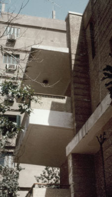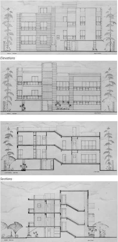 Lot surrounded by two large residential blocks on east and west which dictated a North-South orientation for the building with window opening only to those directions of street and backyard. Internal organization of unit is based on a split level with lower part for living and upper part for sleeping.